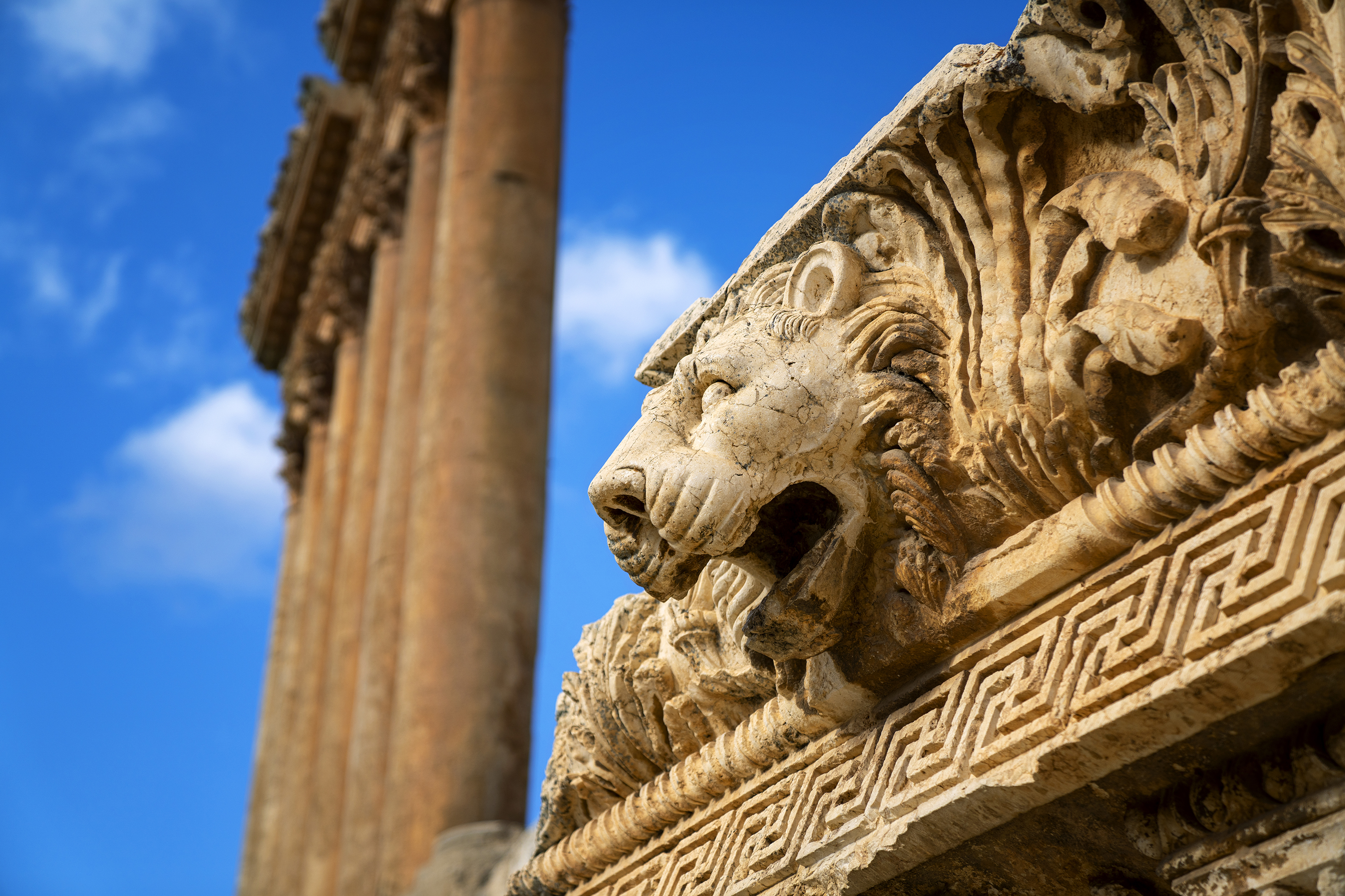 巴勒貝克神廟橫樑上的獅子頭石雕。