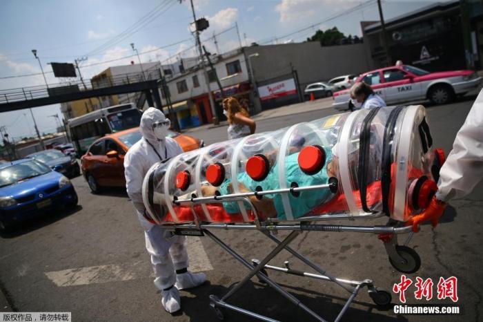 当地时间6月8日,世卫组织卫生紧急项目负责人迈克尔·瑞安表示,从墨西哥到智利,除部分国家以外,拉丁美洲呈现疫情增长模式,令人十分担忧。图为墨西哥首都墨西哥城的医生用救生舱转移新冠肺炎患者。
