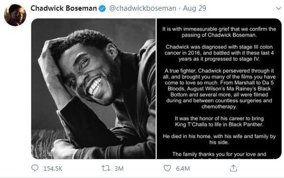 中新网8月30日电 据外媒报道,当地时间8月28日,漫威电影《黑豹》男演员查德维克·博斯曼因结肠癌在家中去世,终年43岁。博斯曼的推特账号当天发布推文确认这一消息,随后这条推文成为推特史上点赞量最高的一条推文。