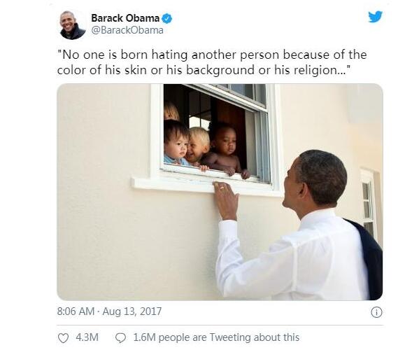 另据报道,推特史上点赞数第二多的推文是美国前总统奥巴马的一条推文,他引用南非前总统曼德拉的名言,“没有人会因为一个人的肤色、背景、宗教天生就讨厌一个人”。他的这条推文获得了430万次点赞。