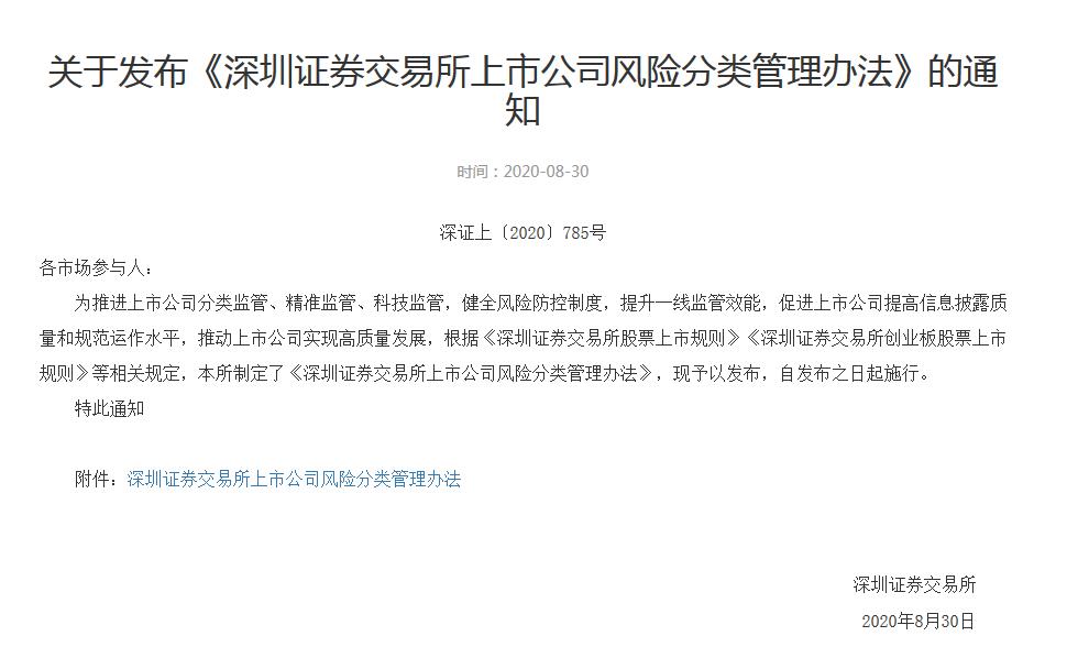8月30日,深交所发布《上市公司风险分类管理办法》,从财务舞弊风险、经营风险、治理及运作风险、市场风险、退市风险五个维度对上市公司风险等级进行评估分类。