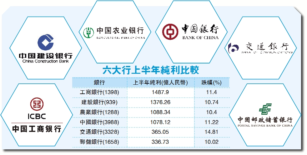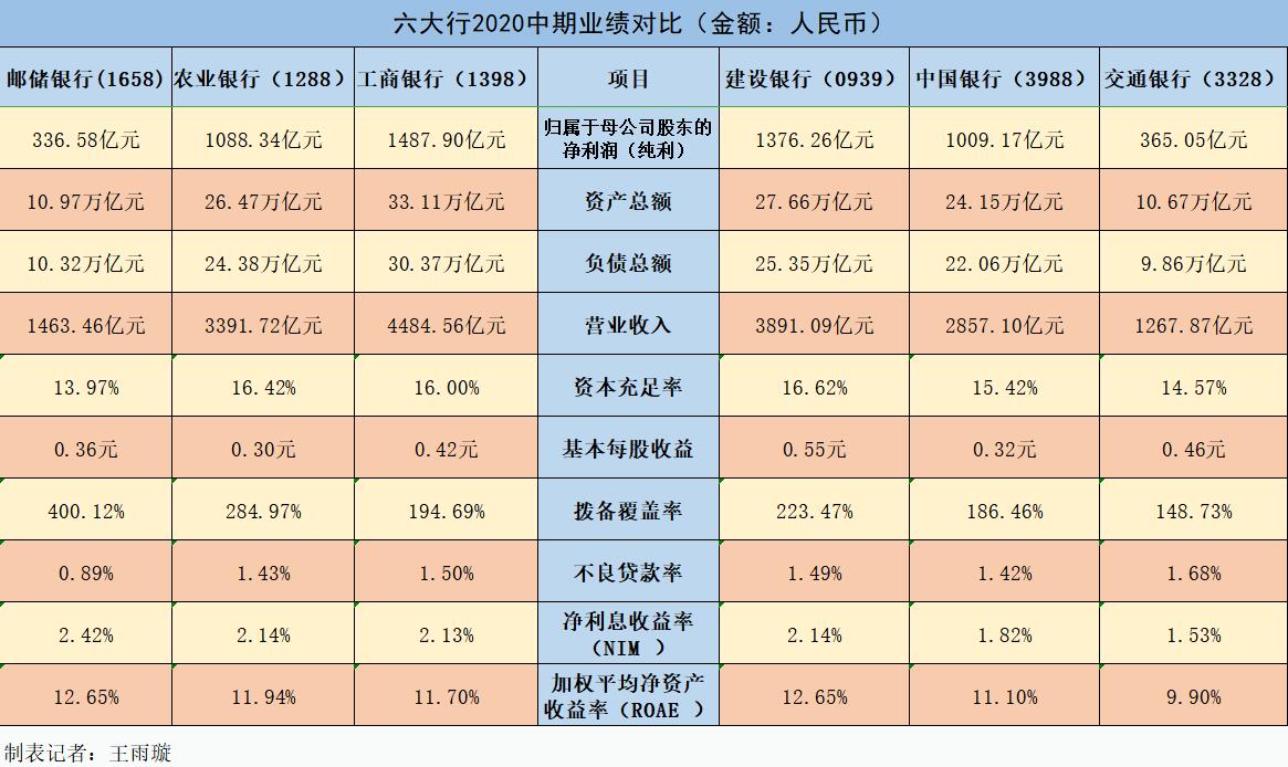 多間重磅內銀同日公布半年業績,疫情之下普遍純利下跌一成左右,表現遠優於外資銀行,例如汇控(005)中期純利按年倒退76.8%。工商銀行(1398)半年純利1487.90億元(人民幣,下同),純利蟬聯六大行之首。建行(939)上半年純利1376億元,以純利計名列第二位;農行(1288)純利1088億元,排名第三位;中行(3988)純利1078億元,屈居第四位;交通銀行(3328)純利365.05億元排第五位;郵儲銀行(1658),純利336.73億元排名第六位。
