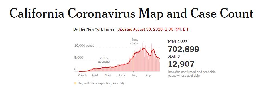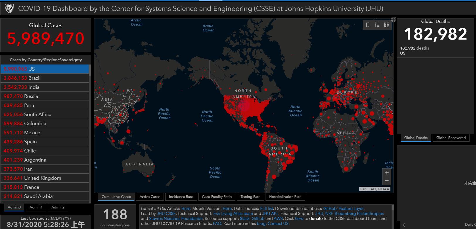 此外,截至香港时间8月31日早5时30分左右,据美國約翰霍普金斯大學數據顯示,全美累計接近599万人感染——5,989,470人確診新型肺炎,182,982人死亡,仍是全球最多确诊及病亡的國家。