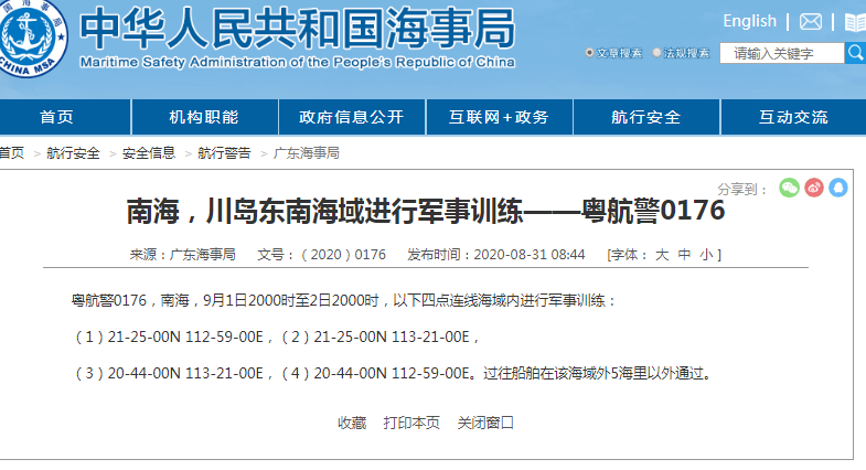 消息显示,粤航警0176,南海,9月1日2000时至2日2000时,以下四点连线海域内进行军事训练: