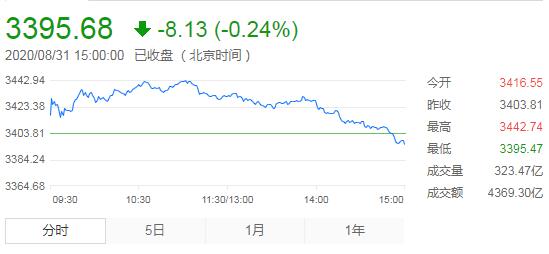 8月31日,星期一,農历七月十三。今日A股三大指数先扬后抑,技术上走出带上影的冲高回落走势。早盘三大指數集體走強,滬指高開后,走出逐波上升走勢,最高漲幅超1%,滬深300指數走勢強勁,觸及自2015年以來新高。午后,走势大变,股指一路震荡下行,三大指数全线走弱。截止收盘,沪指报3395.68点,跌0.24%,成交额为4369亿元(上一交易日成交额为3794亿元);深成指报13758.23点,跌0.67%,成交额为5975亿元(上一交易日成交额为5685亿元);创指报2728.31点,跌1.07%,成交额为2530亿元(上一交易日成交额为2647亿元)。