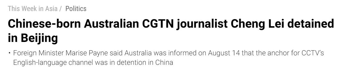综合澳大利亚广播公司ABC消息,一名供职于中国国际电视台(CGTN)英语新闻频道的澳裔女主播在北京被拘留。