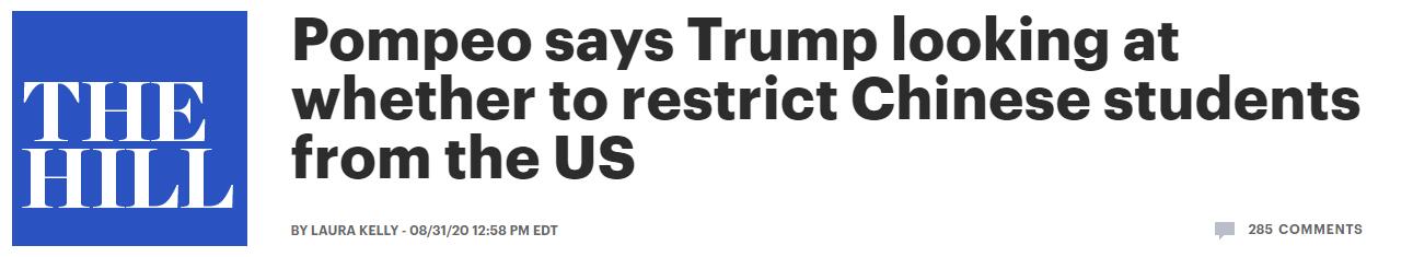 据美媒国会山报31日报道,美國國務卿蓬佩奧表示,美国總統特朗普正考慮限制中國學生到美國留學,特朗普政府可能在未来幾周和幾个月内宣布新措施。