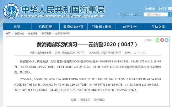 据中国海事局网站9月1日消息,雲航警0047,黄海南部,9月2日至4日每天0800时至1900时在34-45-948N 119-19-728E、34-49-977N 119-18-947E、34-52-688N 119-20-308E、34-51-861N 119-23-816E、34-48-533N 119-23-554E诸点连线範围内进行实弹射击。禁止驶入。