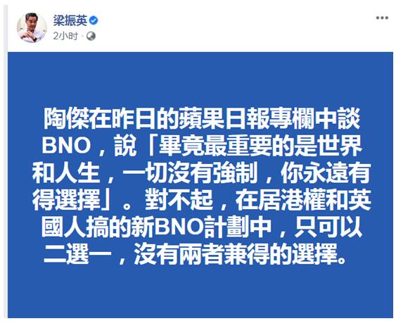 梁振英在另一條臉書中繼續喊話陶傑:「陶傑在昨日的《蘋果日報》專欄中談BNO,說『畢竟最重要的是世界和人生,一切沒有強制,你永遠有得選擇』。對不起,在居港權和英國人搞的新BNO計劃中,只可以二選一,沒有兩者兼得的選擇。」