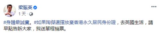 對此,梁振英8月31日在臉書發文揶揄陶傑:「身體最誠實。如果陶傑選擇放棄香港永久居民身份證,去英國生活,請早點告訴大家,我送單程機票。」