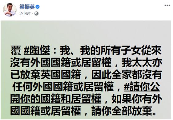 針對陶傑的挑釁,梁振英今天(9月1日)上午在臉書回擊表示:「我、我的所有子女從來沒有外國國籍或居留權,我太太亦已放棄英國國籍,因此全家都沒有任何外國國籍或居留權。」