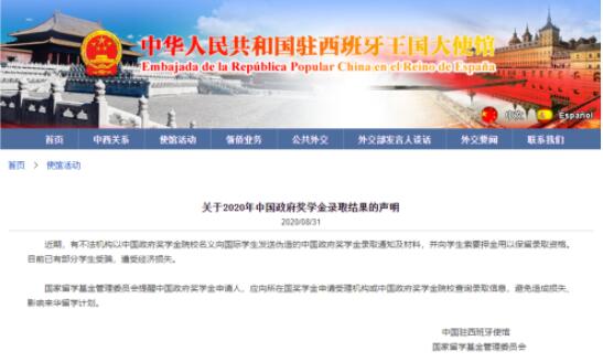 据中国驻西班牙大使馆网站8月31日消息,近期,有不法机构以中国政府奖学金院校名义向国际学生发送伪造的中国政府奖学金录取通知及材料,并向学生索要押金用以保留录取资格。目前已有部分学生受骗,遭受经济损失。