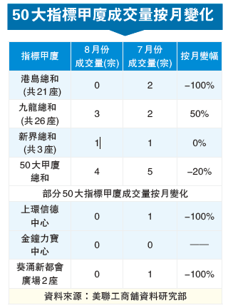 金管局在8月中宣布放寬非住宅物業按揭成數,但寫字樓市場未有明顯受惠。綜合美聯工商舖資料研究部及美聯商業數據顯示,8月份50大指標甲廈合共錄得4宗買賣,宗數較7月份少1宗,最新成交面積逾7300平方呎,按月下降31.2%,且以低價買賣為主,反映「減辣」措施未有對商廈市場帶來明顯刺激。