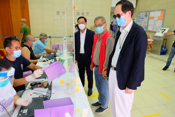 鄉議局主席劉業強今日下午陪同林偉強副主席和莫錦貴副主席到沙田圓洲角社區會堂進行檢測。三位主席均對檢測中心人員不辭勞苦的工作表示衷心感謝。