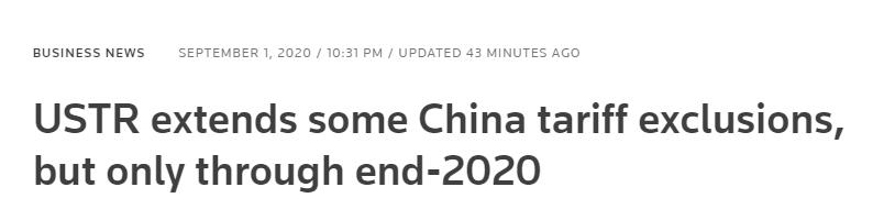 美國宣布延長部分中國商品關稅豁免有效期4個月,至今年年底,但非像過往般延長一年時間,亦無解釋原因。