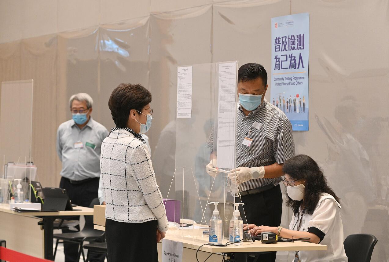 昨晚,林鄭月娥在公務員事務局局長聶德權、食物及衛生局局長陳肇始陪同下,到荔枝角公園體育館社區檢測中心視察計劃首日運作情況,為工作人員打氣,與受檢測市民傾談。她呼籲市民為己為人,立即登記預約參加檢測。
