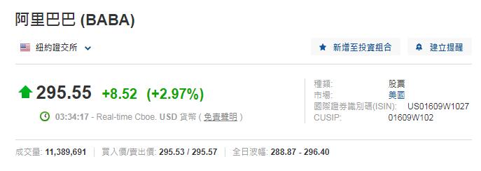 截止发稿,阿里巴巴上涨3.07%报295.89美元,市值8003亿美元。