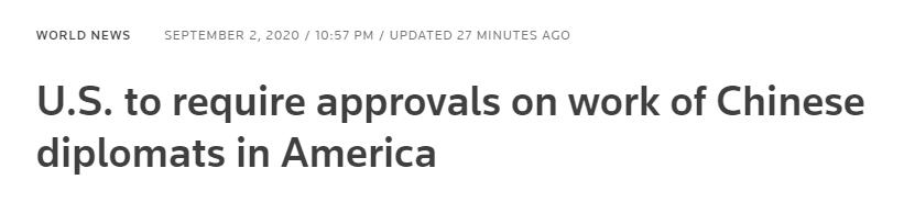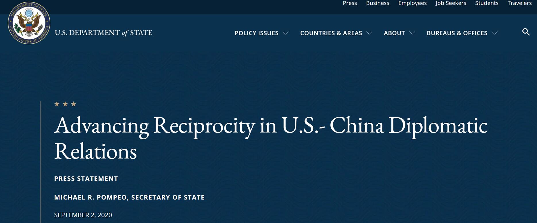 美國國務卿蓬佩奧在簡報會上說:「今天我要宣布,美國國務院已經制定了一種機制,中國在美的高級外交官,需要獲得許可才能訪問大學校園以及與地方政府官員會面;在中國大使館外交駐地以外舉辦人數超過50人的文化活動,也需要獲得許可。」他還宣稱,此舉是對北京的回應。