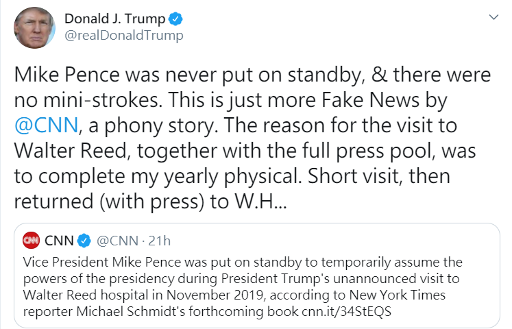 特朗普直接轉發了CNN的報道後說,「彭斯從未處於待命狀態,我也沒有出現過輕度中風。這只是CNN造出來的更多假新聞中的一條而已。我去沃爾特里德國家軍事醫學中心是為完成一年一度的體檢。」