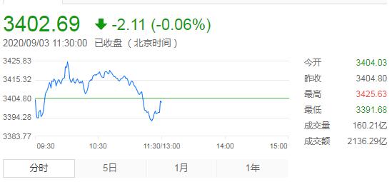 截止中午收盘,沪指报3402.69点,跌0.06%,成交额为2136亿元;深成指报13852.47点,跌0.25%,成交额为3752亿元;创指报2765.83点,跌0.77%,成交额为1939亿元。