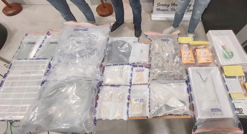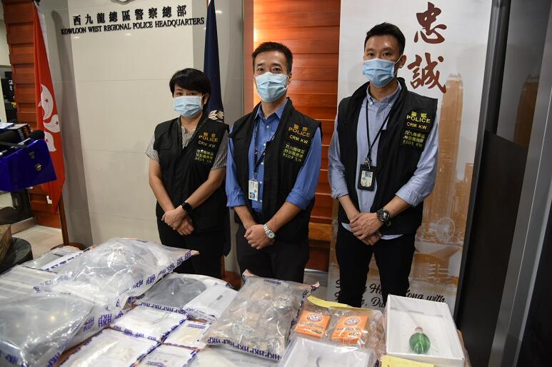 西九龍刑事部鍾雅倫警司表示,西九龍總區特別職務隊人員根據線報,得悉有販毒集團租用住宅單位製毒,經深入調查後,探員在本周一(8月31日)掩至荃灣德士古道39號一個割房單位,當時一名男子正用電子煲製毒,探員當場拘捕2名男子,並在單位內搜出2個麻包袋,內有約3公斤重小型木塊,懷疑當中滲入冰毒,另外檢獲約600克懷疑可卡因和少量懷疑冰毒,及一批製毒工具,包括電子磅和梳打粉等。