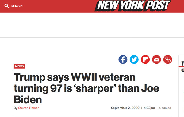 盡管通篇講話特朗普沒有提到一次拜登,但《紐約郵報》2日報道此事時直接稱,特朗普表示97歲的二戰老兵比拜登更“思維敏捷”。