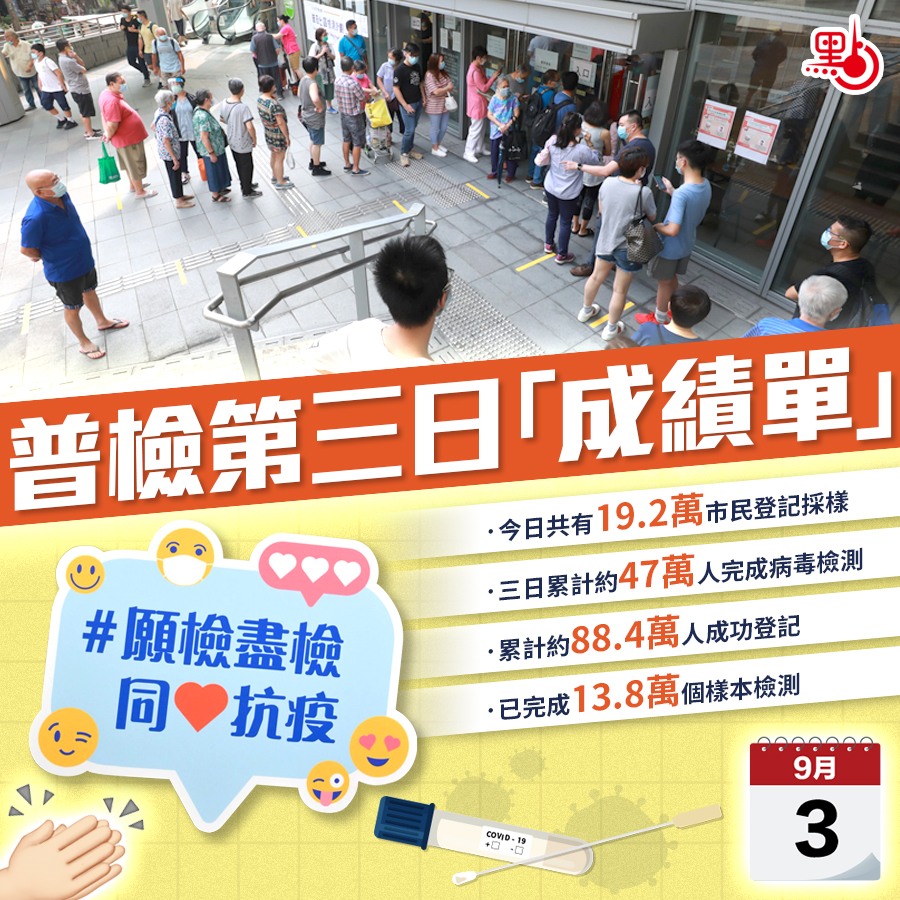 普及社區檢測計劃本月1日展開,市民反應踴躍。政府今晚公布,由今日(3日)早上8時至晚上8時,共有約19.2萬名市民參加普及社區檢測,檢測人數創新高。自普檢在本月1日開展以來,累計合共有約47萬人在檢測中心登記檢測。此外,自8月29日網上預約開始以來,截至今晚8時,累計有約88.4萬人成功預約檢測。