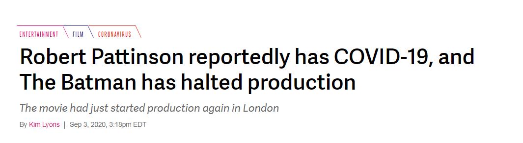 据《名利场》报道,影星罗伯特·帕丁森确诊新冠,其主演的新《蝙蝠侠》电影拍摄已暂停。此前华纳确认有一名《蝙蝠侠》製作团队成员感染了新冠,但没有透露此人的名字,影片拍摄亦暂停。帕丁森方面暂未针对《名利场》的报道做出回复。
