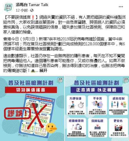 當局昨晚(3日)透過facebook專頁「添馬台」提醒市民,當收到這些單張時,對一些危言聳聽、誇張嚇人的資訊必須查核真偽,以免誤信錯誤的信息,錯失參加普及社區檢測、保障自己和家人健康的機會。