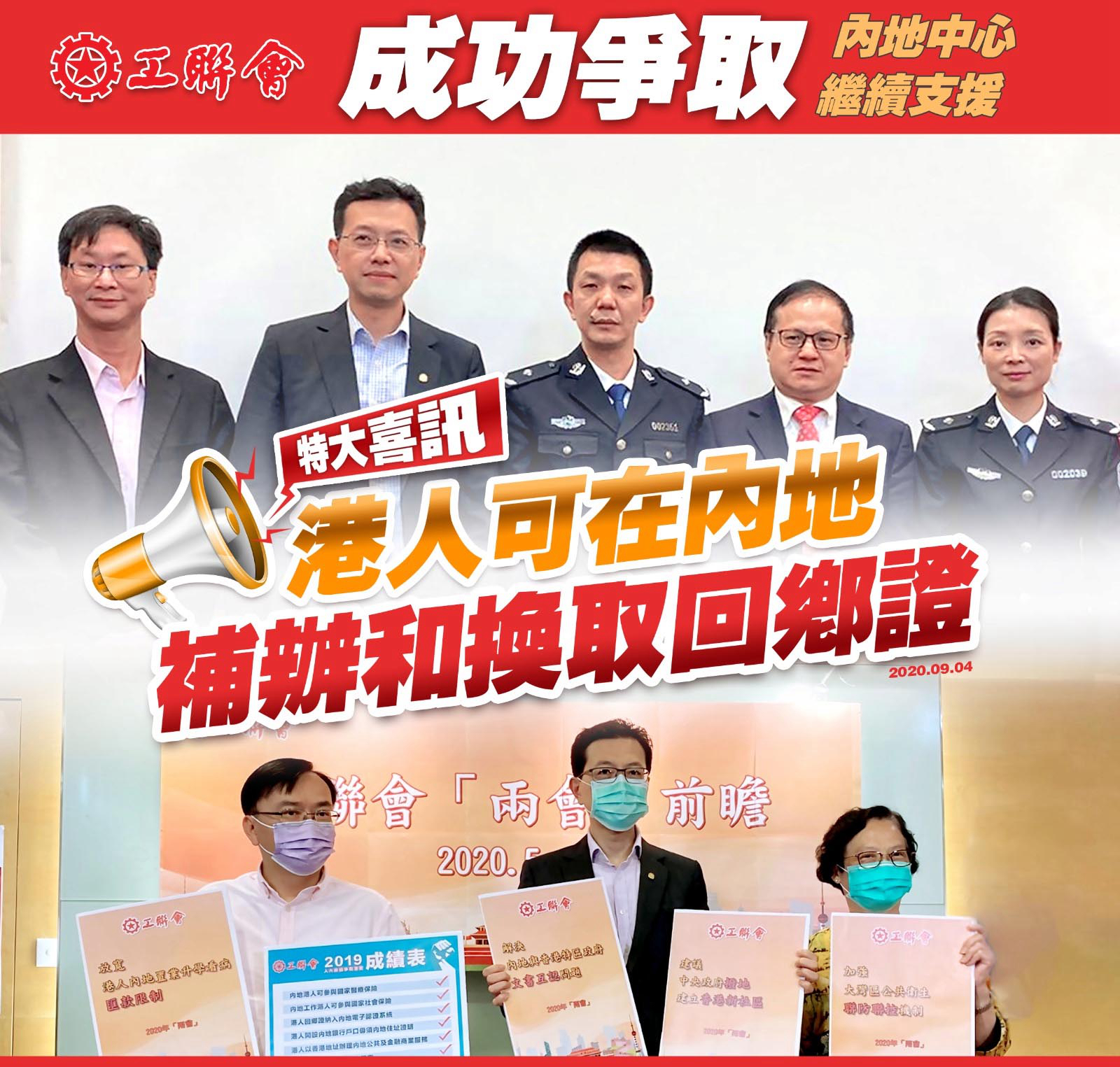 工聯會成功爭取港人可於內地換領回鄉證。工聯會網頁圖片