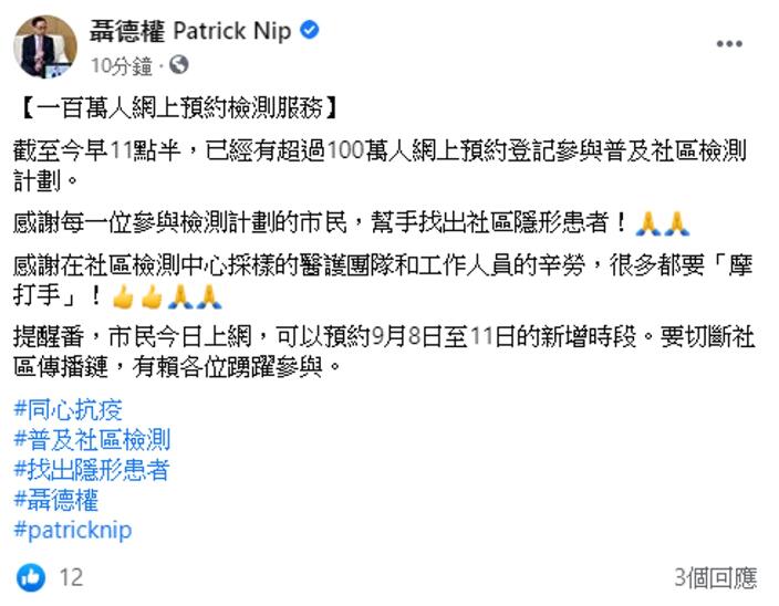 公務員事務局長聶德權表示,截至今日上午11时半,已經有超過100萬人網上預約登記參與普及社區檢測計劃。聶德權在社交網站表示,感謝每一位參與檢測計劃的市民,和社區檢測中心採樣的醫護團隊和工作人員的辛勞。他提醒市民,今日起可以預約下星期二至五的新增時段檢測。