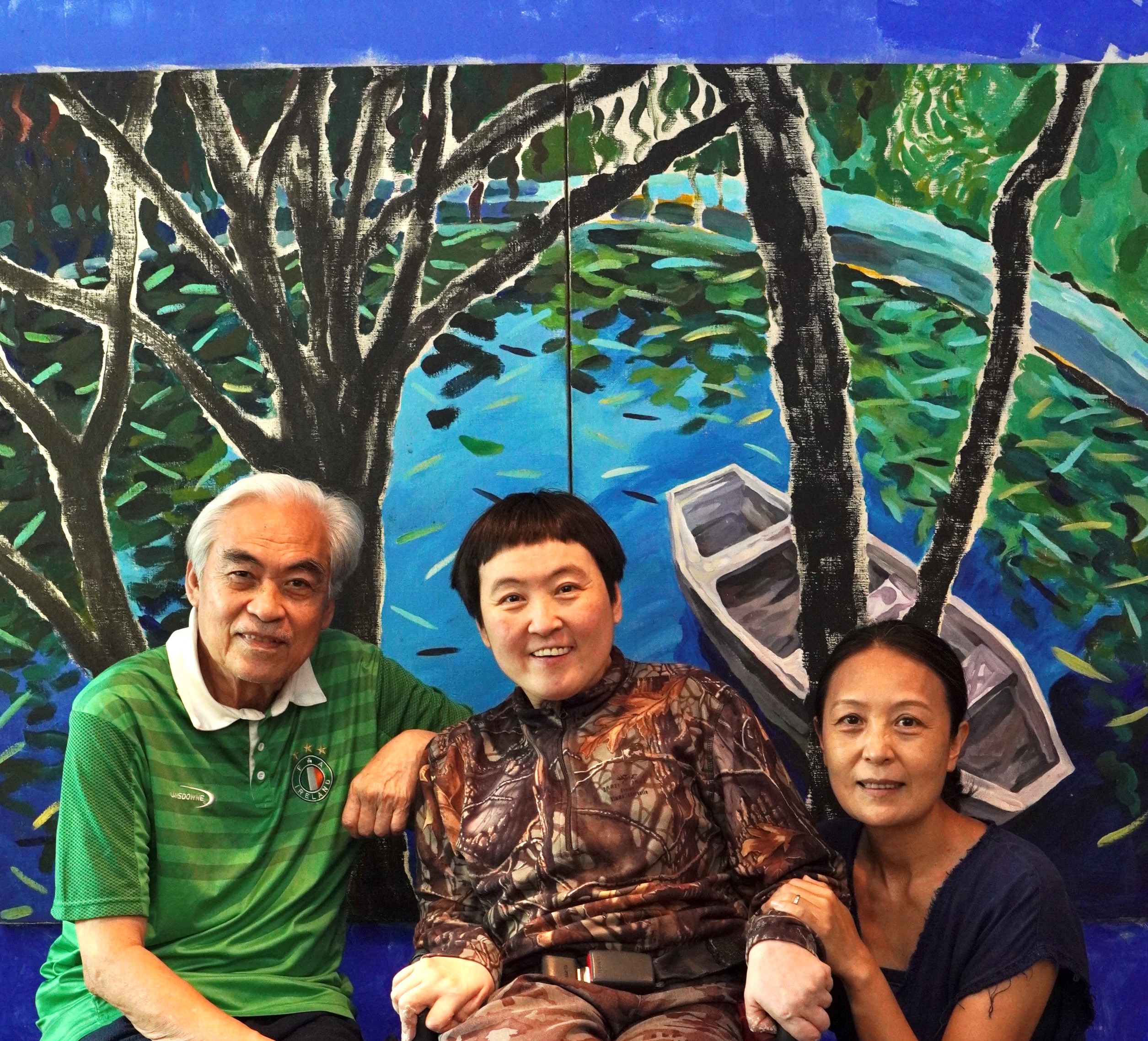 廖東梅(中)很愛笑,性格樂觀、堅毅。訪問當日廖爸爸(左)及姐姐廖井梅(右)陪伴她身旁一同接受訪問。