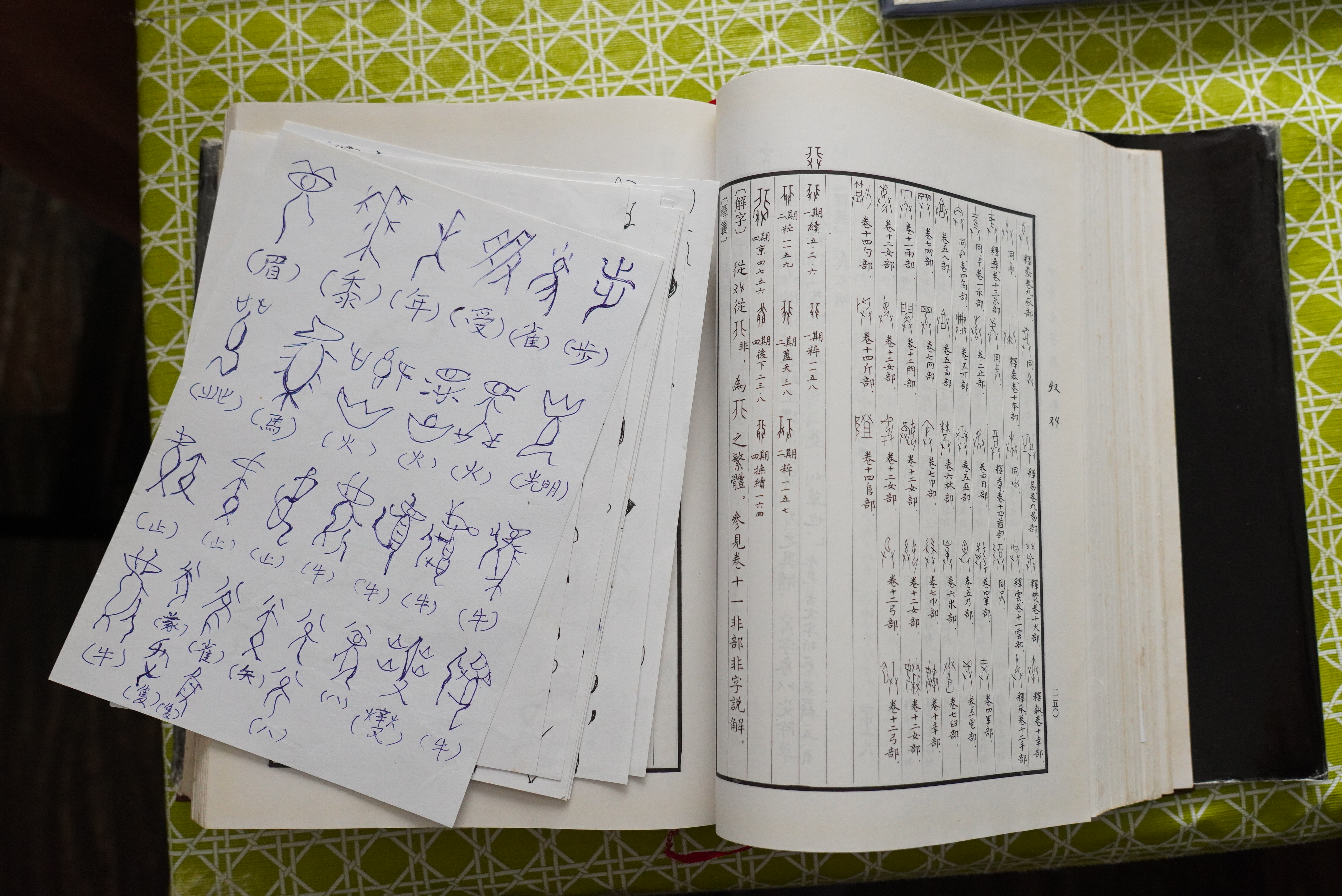 由於以前從未接觸過甲骨文,她便用甲骨文辭典學習,一頁一頁尋找適合的字,並寫草稿練習。