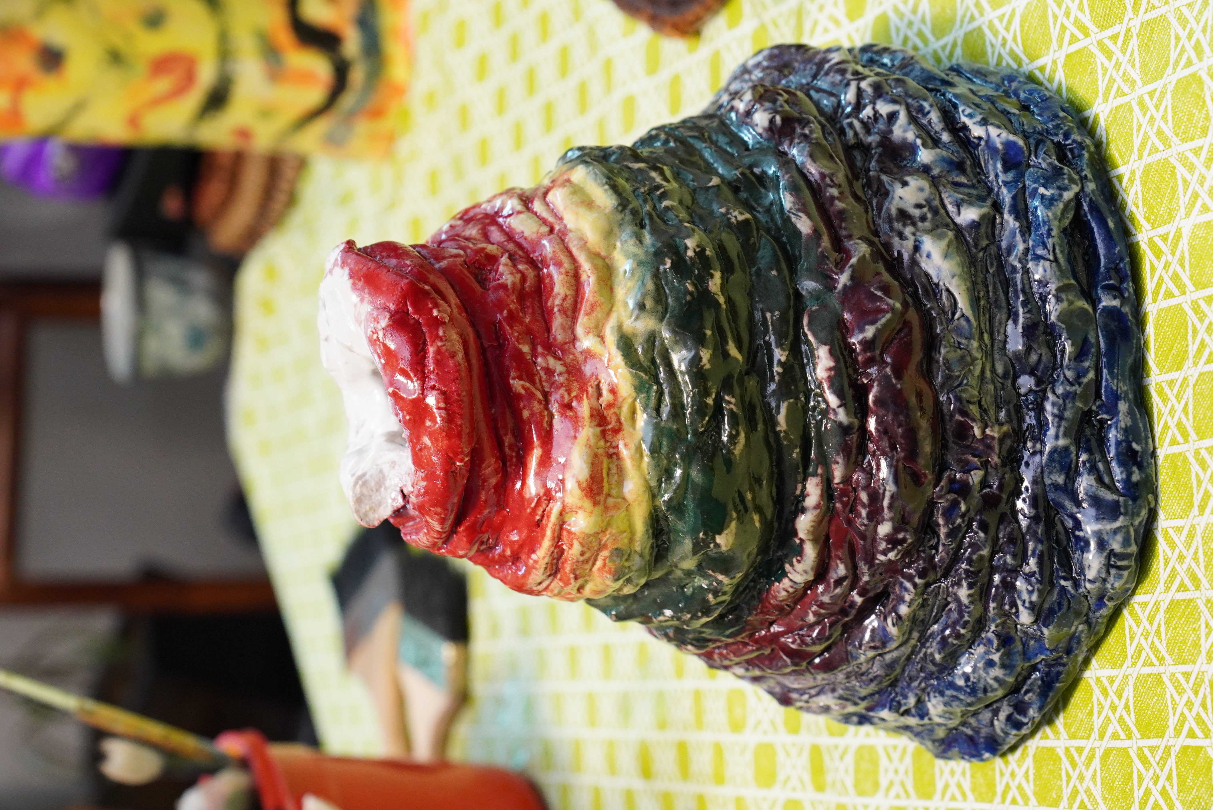 在記者眼中,廖東梅一如那棵柿子樹,生命力充沛。然而,隨着年齡增長,她的身體狀況每況愈下,「常坐輪椅,痙攣壓迫到神經,她的腰骨、腿部都有痛症,有時痛到要服用止痛藥,還會產生不良反應。」廖爸爸心痛地訴說女兒的狀況。但是樂觀的廖東梅不認命,身體變差,不便繪畫,就轉而創作陶瓷,一握一捏,一具陶泥,一個世界。《生命之塔》是廖東梅第一件親手捏造的陶瓷,彩虹色的外表一如其繪畫的色彩繽紛,一圈圈色彩圍成山的模樣,她表示作品反映自己的生命歷程,「一圈圈代表我曾經走過的路,最底下的藍黑色代表我出生時便受到疾病的折磨,曾『死而復生』,也從幾次大病中逃生。一開始生活得很困難,但透過努力,來到香港後終於可發揮自己的才能,生命也有了新開始,所以變成紅色。最上面的白色代表雲,亦是我一直往上走的象徵。」