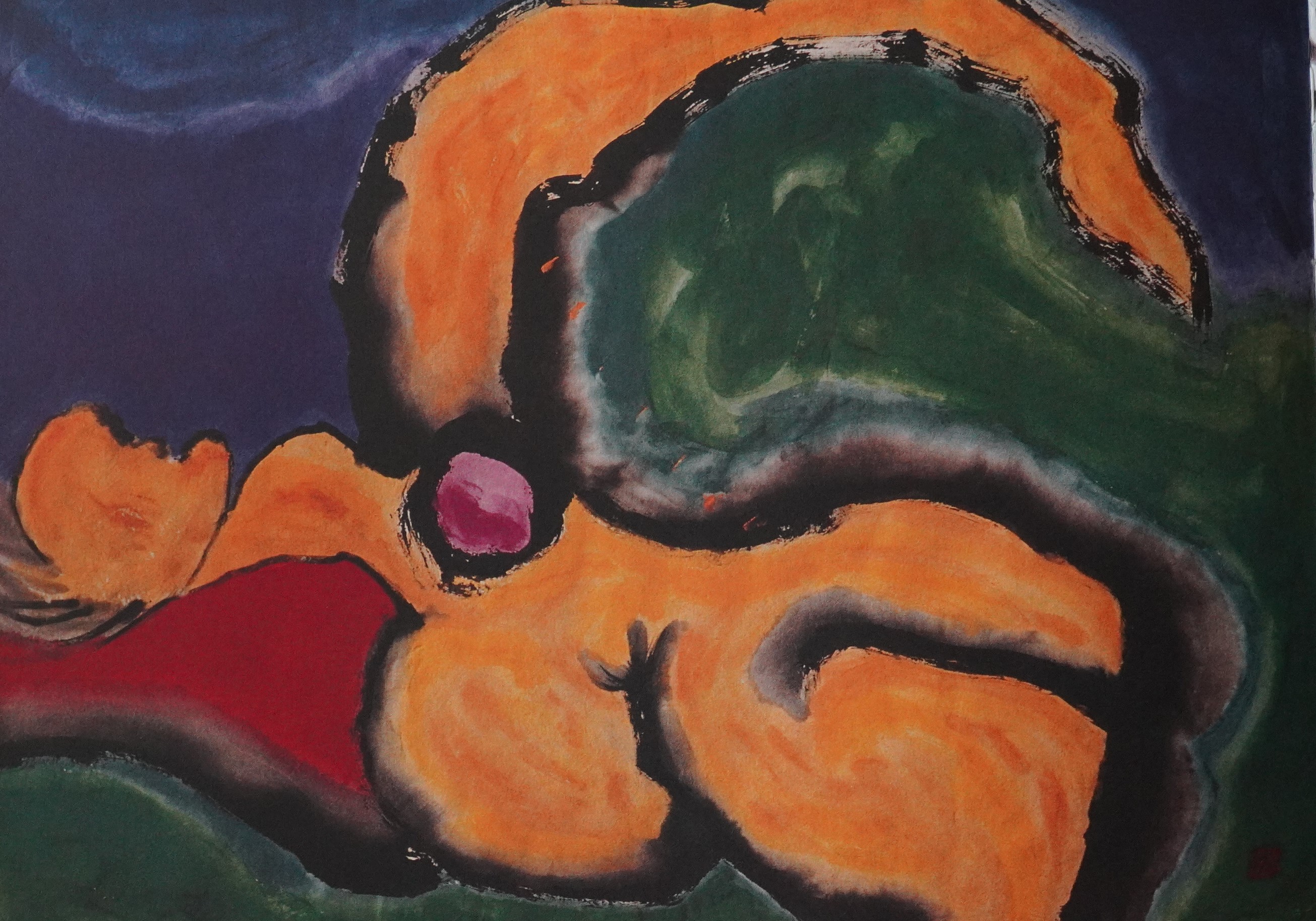 縱使能寫能畫,廖東梅坦言有些題材是自己難以駕馭的,如具象畫,亦一如其他畫家般曾面臨創作困境。由於她下筆時要控制自己,控制顫抖不聽使喚的手,所以她擅長繪寫大線條的抽象作品。「我曾到過日本學習書法,日本書法不單止大,且講究『氣』,當地老師認為我的書法線條有力量感及矛盾感,遂將畫室內最大的毛筆給我書寫。」從日本學成歸來沒多久,廖東梅便接到為「稻鄉飲食文化博物館」作畫的工作,圍繞該集團「傳授為本」、「團隊為基」、「昇華信仰」、「忍耐至上」和「共享收穫」5個理念,繪畫5幅作品。這對廖東梅來說頗有難度,她認為難以用繪畫表達5個主題。苦思良久,才決定用既代表文字又代表圖案的甲骨文創作,發揮書法的優點。如代表「昇華信仰」的「神」字,看似精簡勾畫的黑線,予人強而有力之感,配上鮮豔的色彩,更有中西融合的效果。