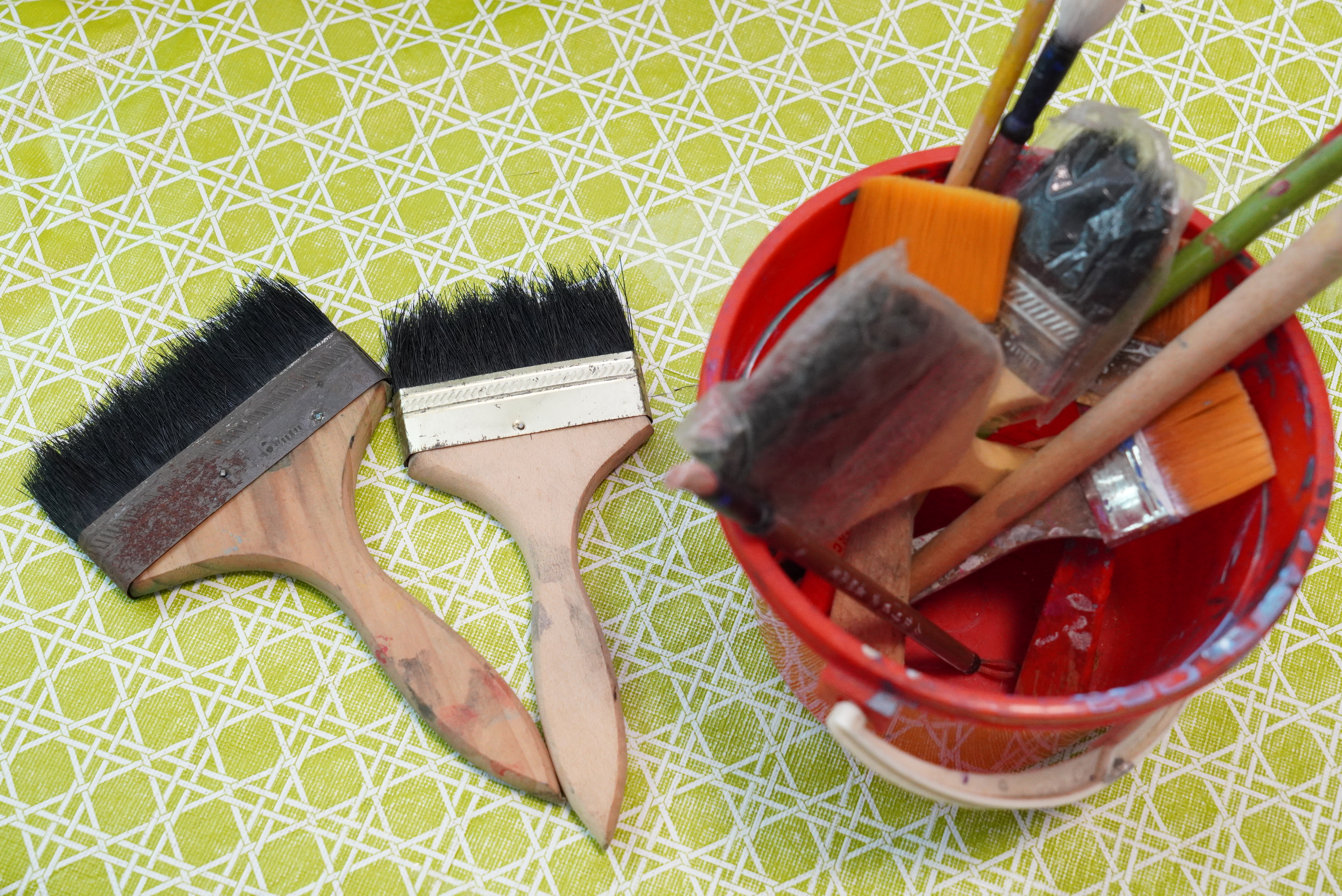 廖東梅使用的繪畫工具有部分是廖爸爸特製,如兩把經過廖爸爸修剪、筆頭參差不平的刷子。