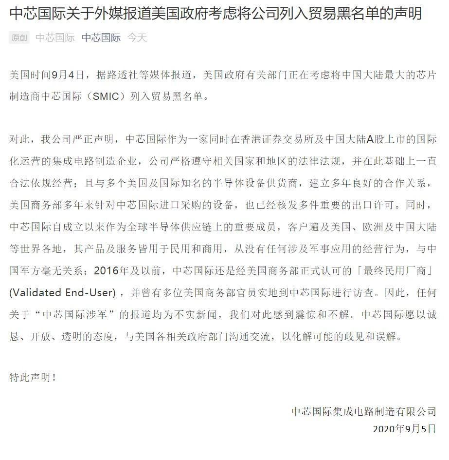 任何关于“中芯国际涉军”的报道均为不实新闻,我们对此感到震惊和不解。中芯国际愿以诚恳、开放、透明的态度,与美国各相关政府部门沟通交流,以化解可能的歧见和误解。