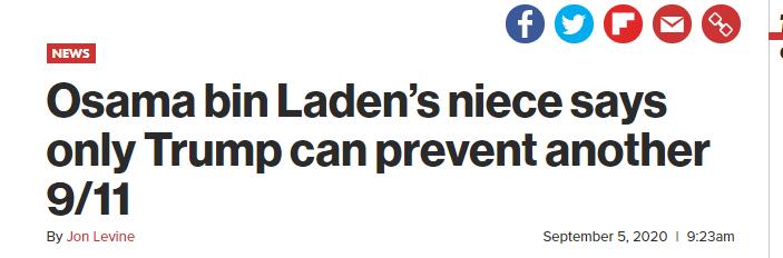 已故恐怖主义头目本 · 拉登的侄女努尔 · 本 · 拉登在接受《华盛顿邮报》采访时警告说,如果乔 · 拜登当选总统,另一场「911」式的恐怖袭击可能即将发生。努尔 · 本 · 拉登是「911」事件策划者、恐怖主义头目奥萨马·本·拉登同父异母哥哥叶斯拉姆·本·拉登的女儿。
