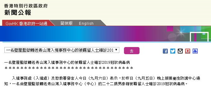 港府6日凌晨2时发布新闻公报称,一名由壁屋監獄服刑完畢,轉送青山灣入境事務中心等候遣返的22歲泰國籍男子確診感染新型冠狀病毒。因應新冠疫情,現時所有新進入中心的被羈留人士,均須接受2019冠狀病毒病測試。九月四日,該名於壁屋監獄服刑完畢的在囚人士被送往中心等候遣返。他在接受測試後,於昨日晚上獲通知確診2019冠狀病毒病,已即時送往醫院接受治療。