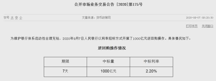 中国人民银行7日公告称,为维护银行体系流动性合理充裕,2020年9月7日人行以利率招标方式开展了1000亿元7天期逆回购操作,中标利率维持2.20%不变。7日有800亿元逆回购到期,实现净投放200亿元。