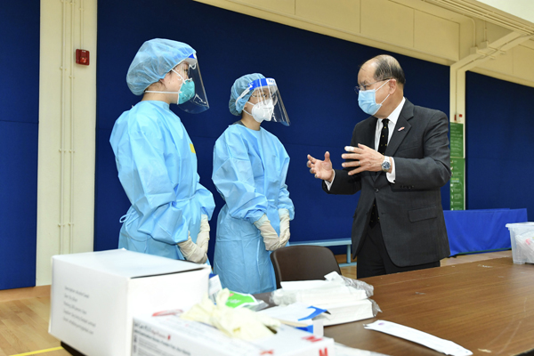 政務司司長張建宗今日(7日)到位於灣仔修頓場館、北角渣華道體育館和黃竹坑體育館的社區檢測中心,為醫護和工作人員打氣,並了解各中心運作情況。