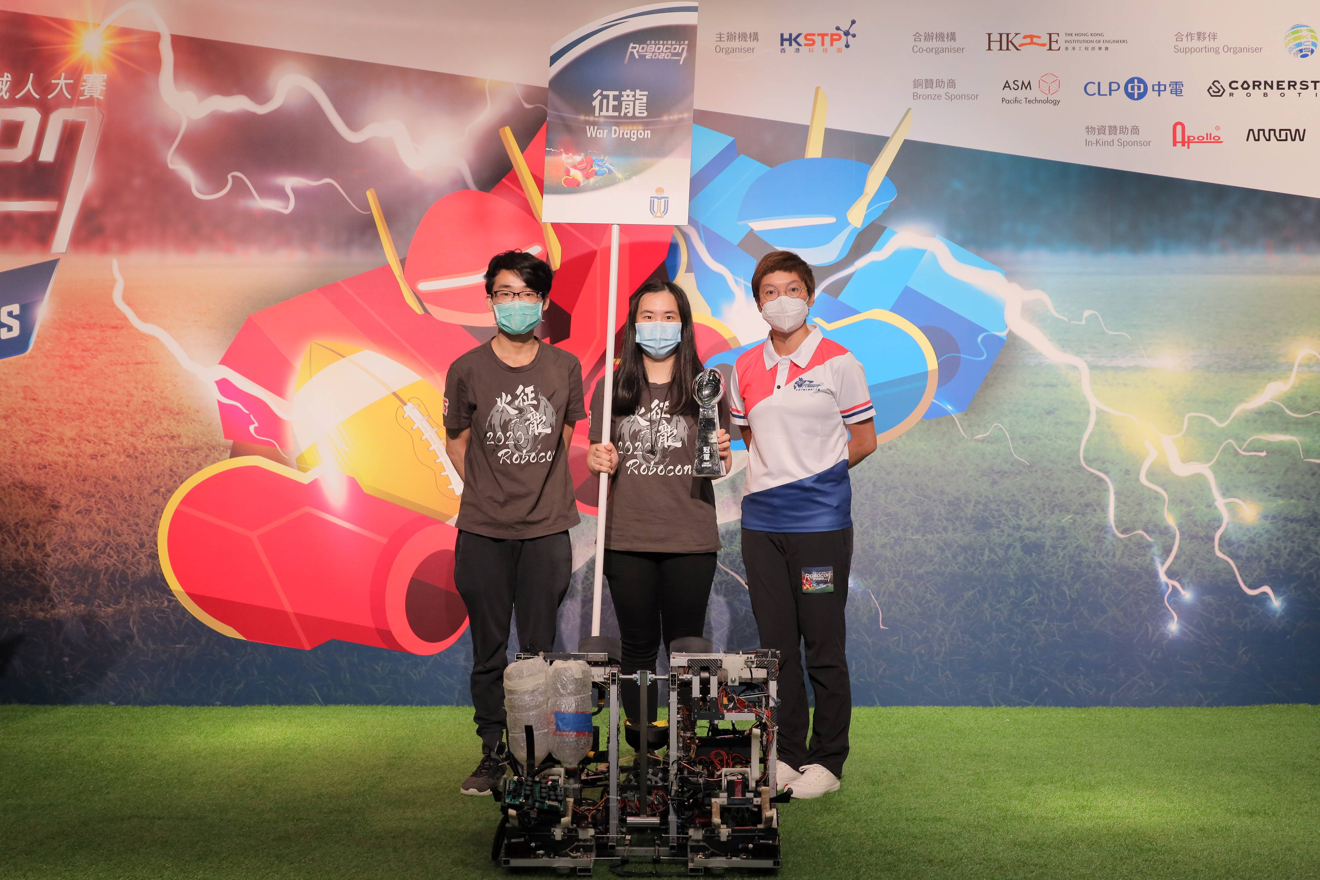 香港科技園公司今日(7日)舉辦「全港大專生機械人大賽2020」,香港科技大學團隊「征龍」獲賽事籌備委員會主席霍露明頒發冠軍獎座。