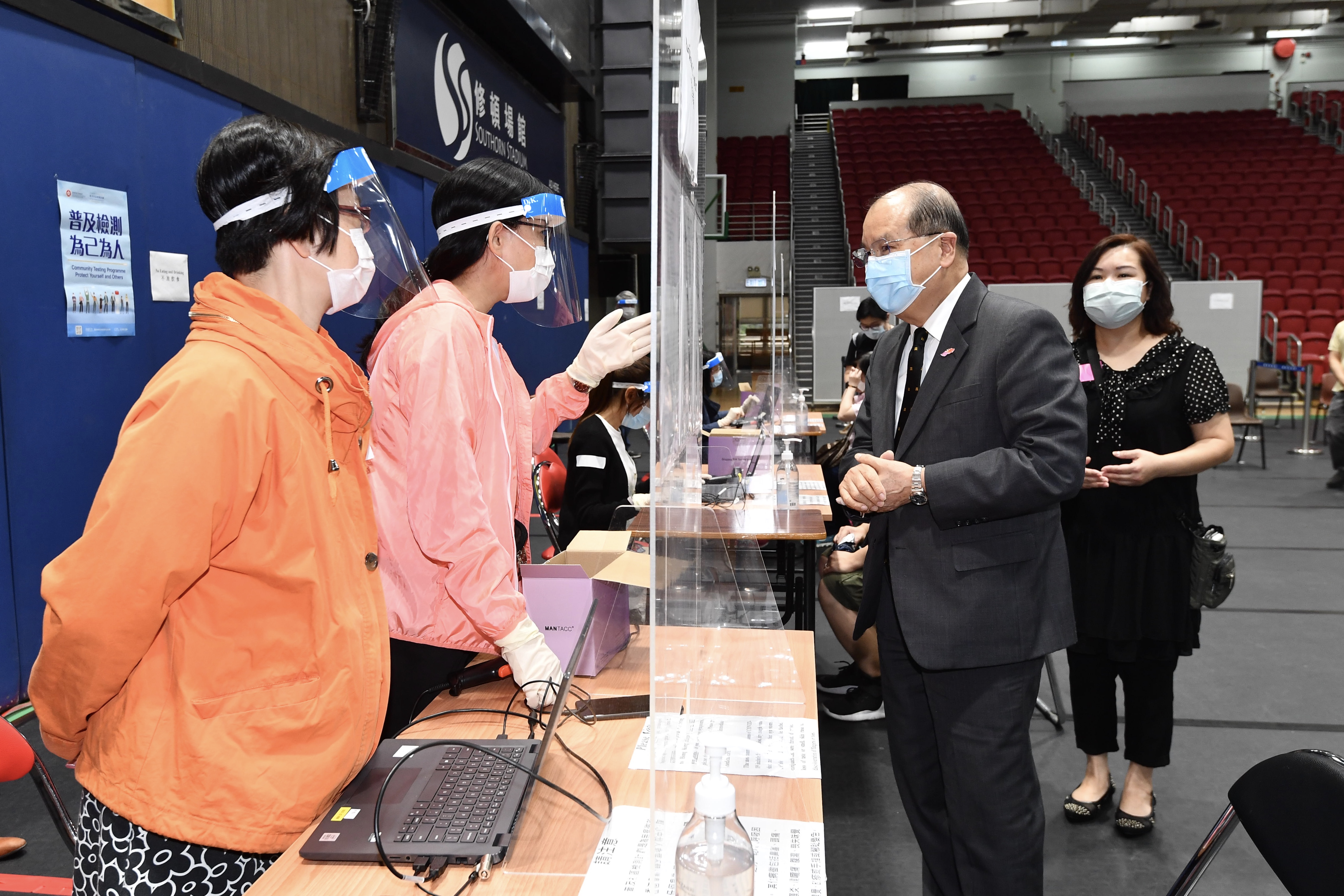 9月7日,香港政务司司长张建宗(右二)来到位於湾仔修顿场馆的社区检测中心,为医护和工作人员打气,并了解检测中心运作情况。中新社