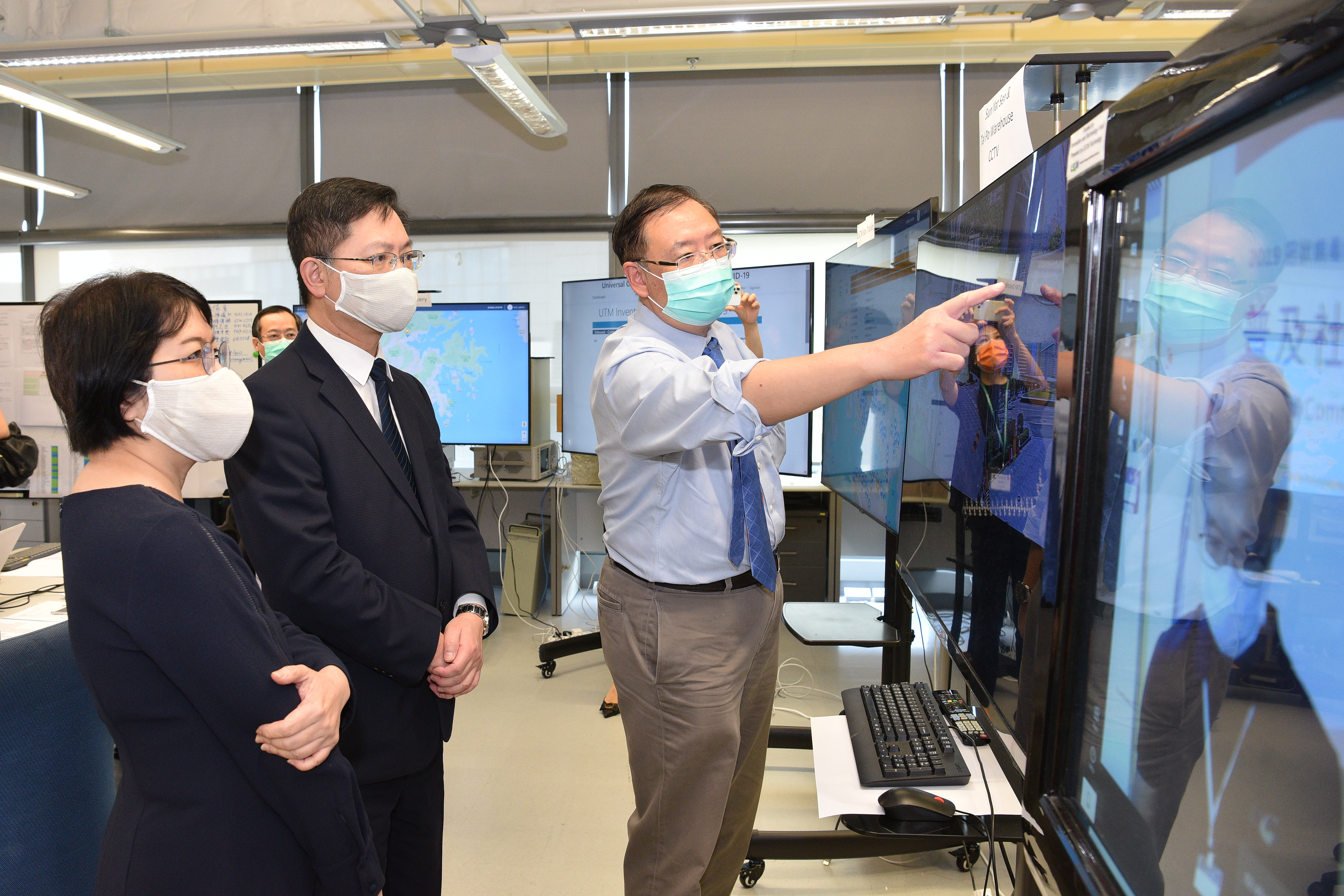 9月7日,创新及科技局局长薛永恒(中)和创新及科技局常任秘书长蔡淑娴(左)探访物流及供应链多元技术研发中心为普及社区检测计划设立的指挥中心期间,听取物流及供应链多元技术研发中心行政总裁黄广扬(右)讲述电子追踪样本收集箱及物流车辆位置的运作情况。中通社