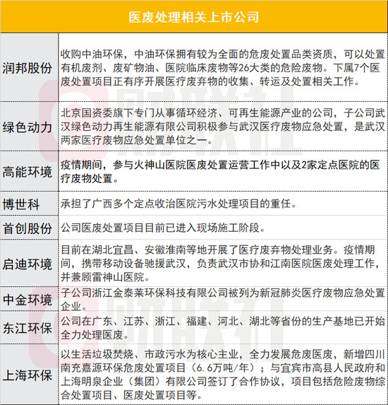醫療垃圾的處理,需要有專門的危險廢物經營許可證,隨著未來醫廢收費引入市場化機制,具備處置能力的企業有望收獲業績彈性。財聯社整理醫廢處理相關概念股,包括潤邦股份(5.520, -0.01, -0.18%)、高能環境(15.710, -0.10, -0.63%)、啟迪環境(8.470, 0.11, 1.32%)、中金環境(4.520, 0.05, 1.12%)、東江環保(9.760, -0.03, -0.31%)等。