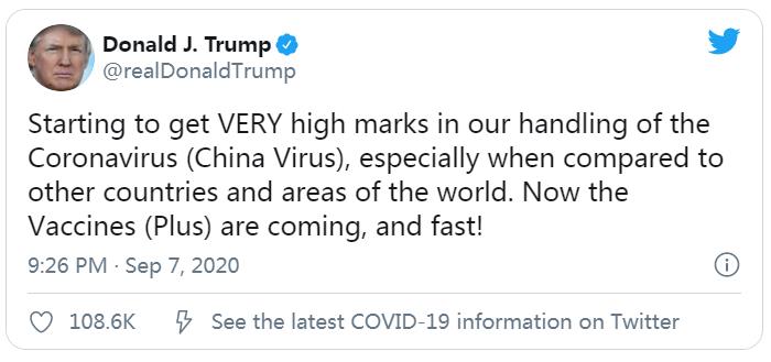 美国总统特朗普9月7日在社交平台帖文,指美国处理新型冠状病毒疫情上,获得十分好的评价,特别是与其他国家比较,他又指疫苗快将面世。他在提及新冠病毒时,在推文中还特意标明「中国病毒」。