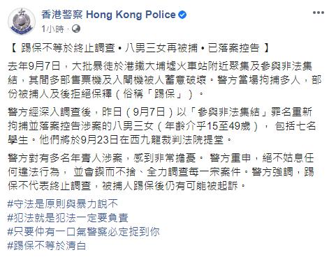 警方經深入調查後,昨日(9月7日)以「參與非法集結」罪名重新拘捕並落案控告涉案的八男三女(年齡介乎15至49歲), 包括七名學生。他們將於9月23日在西九龍裁判法院提堂。