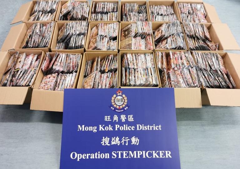 旺角警區特別職務隊根據線報及經深入調查,昨日(8日)下午進行代號「搜鷁」的掃黃行動,突撃搜查旺角砵蘭街一唐樓單位,共檢獲約10000隻總值約20萬港元的懷疑色情光碟,以及現金560港元。警方拘捕1名48歲本地男子,他涉嫌「管有淫褻物品以供發布用途」及「發布淫褻物品」,被扣留調查。