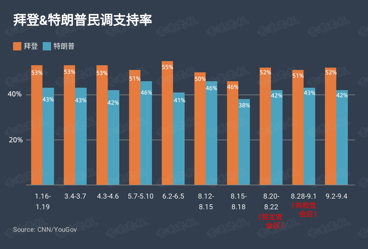 在两党大会之後,两人支持率均有上涨,但根据最新数据显示,拜登还是领先於特朗普十个百分点,选情趋於胶着状态。