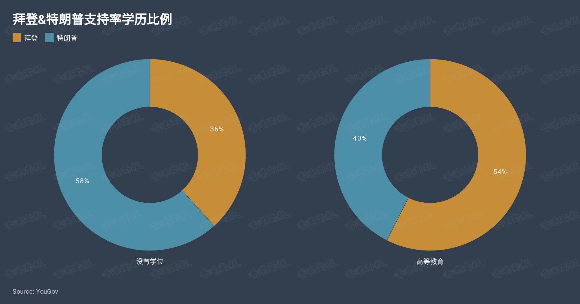 按照学历来看,受过高等教育的选民大都支持拜登,而学历较低的选民则支持特朗普,且两种不同群体对於两位候选人的支持率均有十幾个百分点的差距。